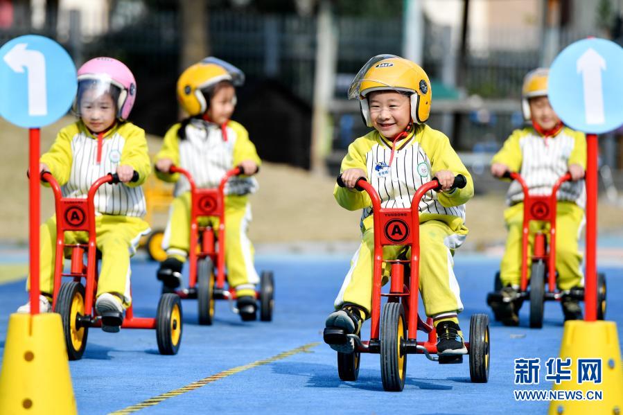 11月30日,浙江省湖州市長興縣龍山幼兒園的孩子們在做“安全騎行”游戲。新華社發(譚云俸 攝)