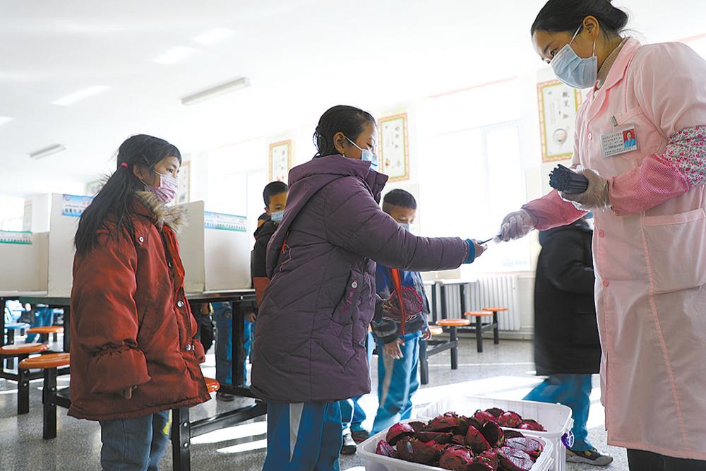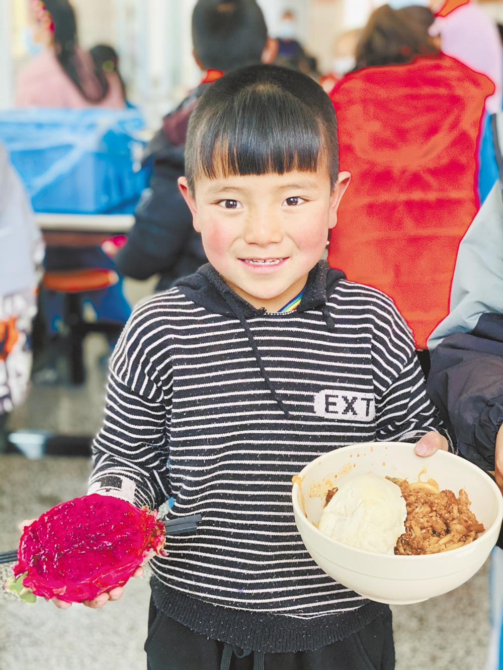 12月1日,記者來到海南藏族自治州貴德縣常牧鎮民族寄宿制小學曲丹峪教學點。恰逢午飯時間,記者注意到,今天孩子們的午飯是清炒菜花、爆炒羊肉、酸菜粉條還外加半個火龍果。只見孩子們排著有序的長隊走進食堂,打完飯菜后便安靜、有序地坐在自己的座位上。