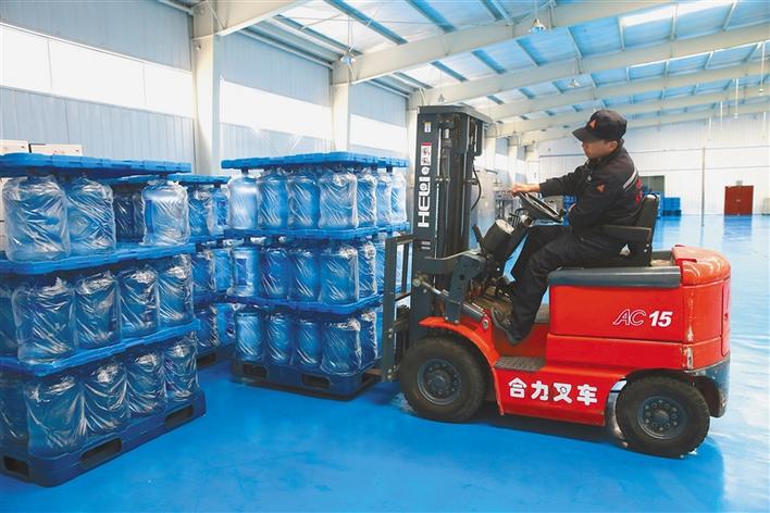 圖為在山南市雅礱天然飲品公司,當?shù)卮迕翊稳蕷W珠正搬運大桶水。 本報記者次珍攝