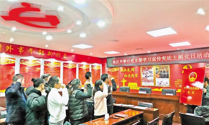 地區外事辦黨支部組織黨員干部在機關活動場所舉辦學習宣傳憲法主題黨日活動。