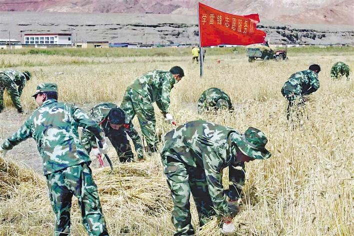 圖為駐地部隊組建“學雷鋒志愿服務隊”幫助烏江村村民秋收。