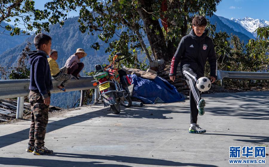 在西藏林芝市墨脫縣德興鄉(xiāng)巴登則村,旺前羅布向弟弟們展示自己的球技(2月9日攝)。新華社記者 羅博 攝