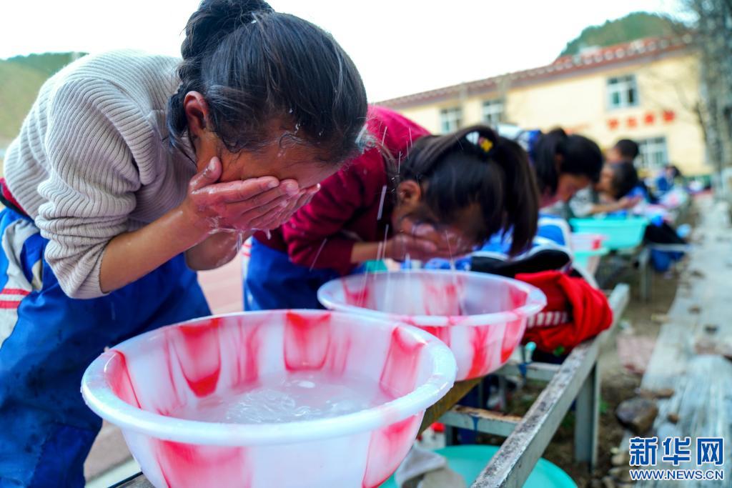4月30日,在西藏昌都市類烏齊縣桑多鎮第二小學,學生們用熱水洗漱。這套熱水設施由李純民發起的“齊興”助學獎勵基金捐助。新華社記者 黃臻 攝