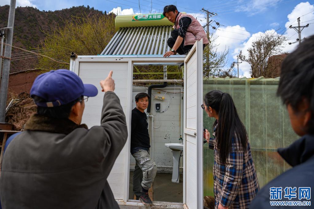5月2日,在西藏昌都市類烏齊縣濱達鄉濱達村,李純民(左二)在當地村民向巴巴登(右二)家中查看沼氣罐的使用情況。新華社記者 劉金海 攝