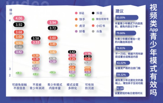 面對(duì)目前各平臺(tái)青少年模式良莠不齊的現(xiàn)狀,參與測(cè)評(píng)的大學(xué)生也有自己的見解。在剛剛畢業(yè)1年的95后教師姜煒眼里,部分軟件青少年模式下推薦的內(nèi)容不能滿足青少年的興趣。“好看視頻給我推薦的都是動(dòng)畫片,我教的高中生不太感興趣;小紅書的青少年模式入口有點(diǎn)難找,找到以后推薦給我的都是考研相關(guān)內(nèi)容,對(duì)未成年人來說可讀性不高;斗魚、虎牙這類直播平臺(tái),本身大部分都是游戲類內(nèi)容,青少年模式下幾乎大多數(shù)內(nèi)容都會(huì)被屏蔽,我相信任何使用這兩款軟件的青少年都不愿意使用青少年模式。”不過,他給抖音和B站打了高分。“這兩款軟件的推送內(nèi)容除了有興趣類的,還有一些名師課程,符合青少年的興趣。”