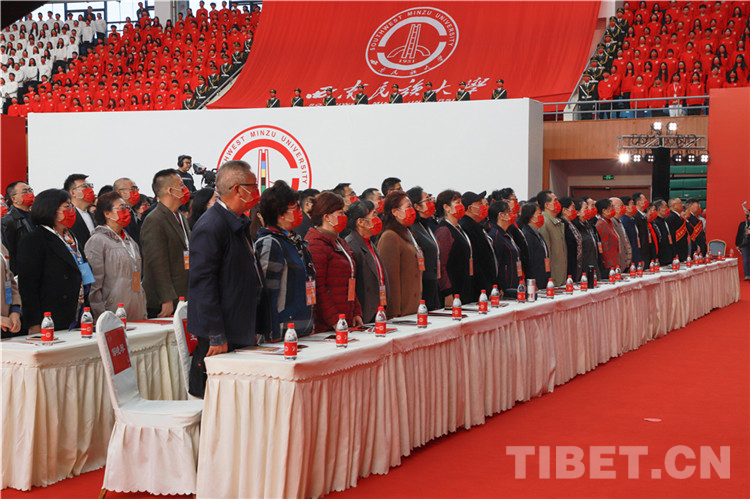 大會在雄壯的國歌聲中拉開帷幕,西南民族大學黨委書記楊敏宣布慶祝大會開始。