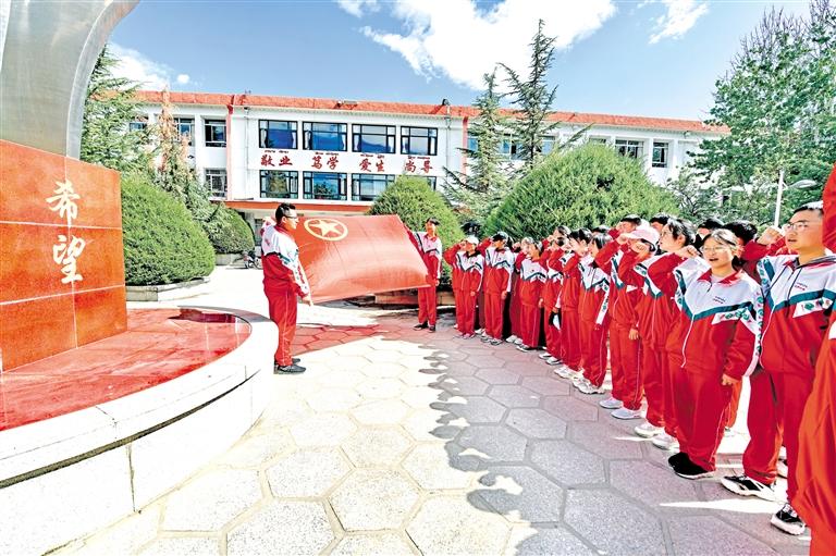 圖為拉薩中學的學生在團旗下重溫入團誓詞。