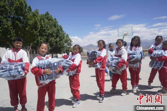 圖為拉薩出入境邊防檢查站的民警為學(xué)生發(fā)放校服。 貢嘎來松 攝