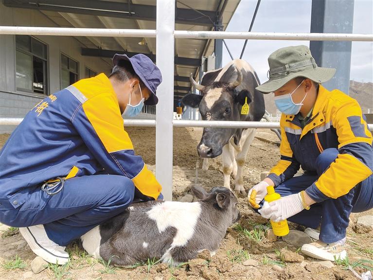 走進(jìn)格桑塘現(xiàn)代農(nóng)牧產(chǎn)業(yè)示范園,工作人員強(qiáng)久和土旦達(dá)杰嫻熟地在給小奶牛的肚臍消毒,這是他們工作3年時間順利接生的第43頭小奶牛。