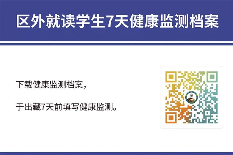 根據(jù)拉薩市委、市政府和自治區(qū)教育廳部署安排,為準(zhǔn)確掌握學(xué)生出藏行程規(guī)劃,為民航、鐵路等交通部門調(diào)配運(yùn)力提供參考依據(jù),拉薩市教育局需精準(zhǔn)掌握居住在拉薩市的區(qū)外就讀西藏籍大學(xué)生、區(qū)外非西藏班就讀西藏干部職工子女、區(qū)外就讀進(jìn)城務(wù)工人員子女、旅居區(qū)內(nèi)的區(qū)外學(xué)生出藏相關(guān)信息,請(qǐng)廣大家長、學(xué)生積極配合,掃描以下二維碼,填報(bào)出行信息;下載健康監(jiān)測(cè)檔案,于出藏7天前填寫健康監(jiān)測(cè)。