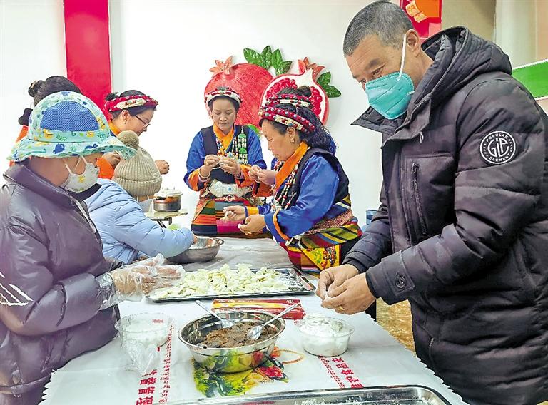 圖為日喀則市桑珠孜區吉培社區各族群眾在社區食堂包餃子、包湯圓。記者 陳林 攝