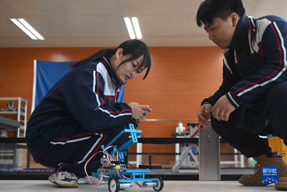 2月23日,西寧果洛中學學生在機器人教室內操作自己組裝的機器人。新華社記者 張龍 攝