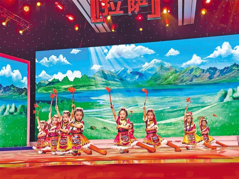 圖為拉薩市實驗幼兒園東城分園的小朋友在表演舞蹈《歡樂的熱巴》。