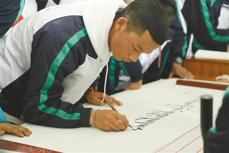拉薩北京實驗中學教師洛桑多吉精通藏文書法,有著豐富的傳統藏文書法教學經驗,他堅持長期輔導學生,讓學生在書法練習中陶冶性情,靜心修身;在書法進益的過程中感受傳統文化的魅力,提升學習能力。