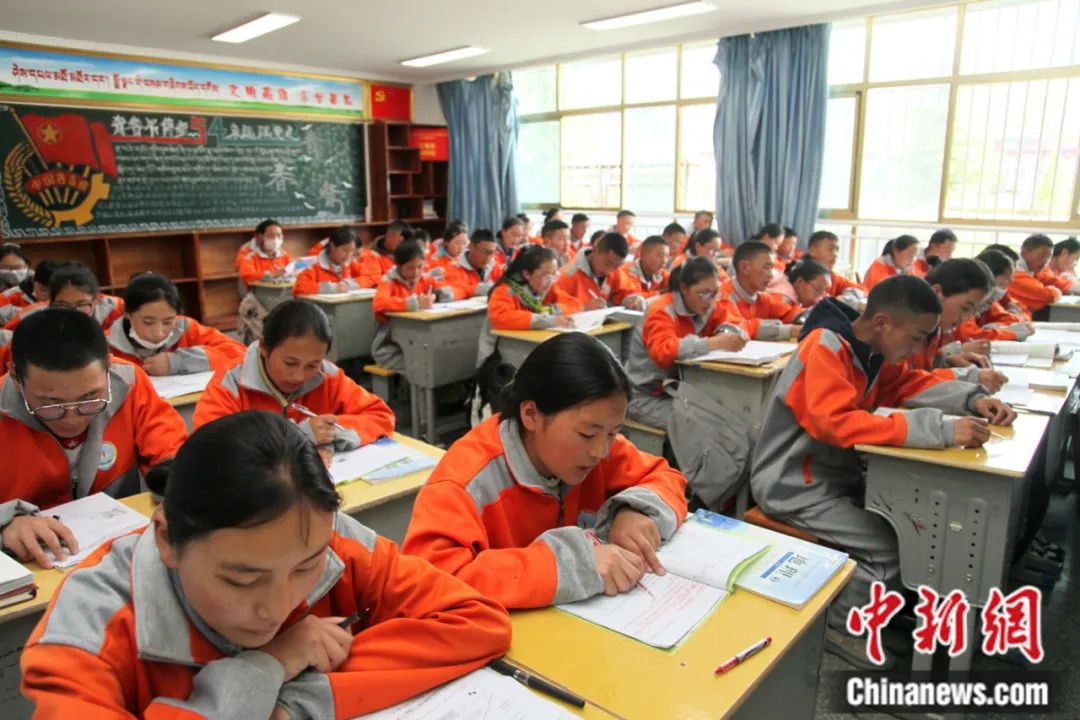 那曲平均海拔達4500米以上,高寒缺氧,一些學校難以留住優秀教師,學生的學習也受環境限制。因此,西藏探索在海拔相對低些的拉薩進行異地辦學,為那曲學生提供更好的學習條件。圖為拉薩那曲第二高級中學的學生正在上課。陳小愿 攝