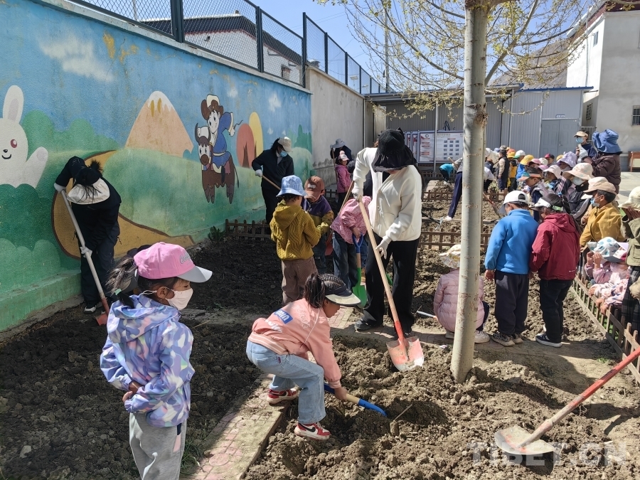 圖為拉孜縣幼兒園的孩子們在校園刨土種花