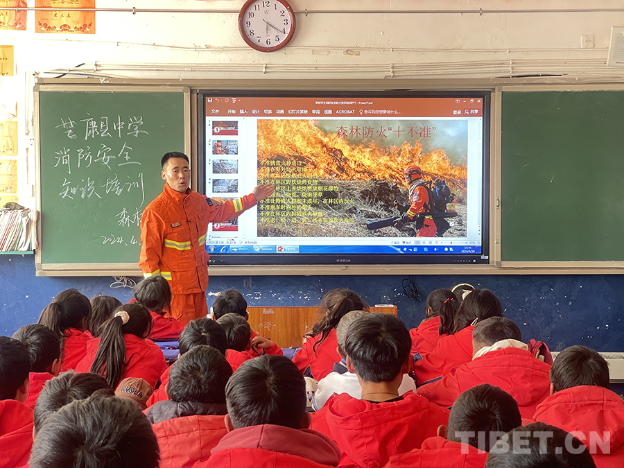在芒康縣中學(xué)授課現(xiàn)場,芒康縣森林消防分隊(duì)負(fù)責(zé)人夏能向全校師生講解森林防火的重要意義、火災(zāi)的起因、相關(guān)法律法規(guī)和常用防火知識(shí)等,教育引導(dǎo)同學(xué)們樹立森林防火意識(shí),做到不帶火種進(jìn)山,發(fā)現(xiàn)火情及時(shí)報(bào)警。