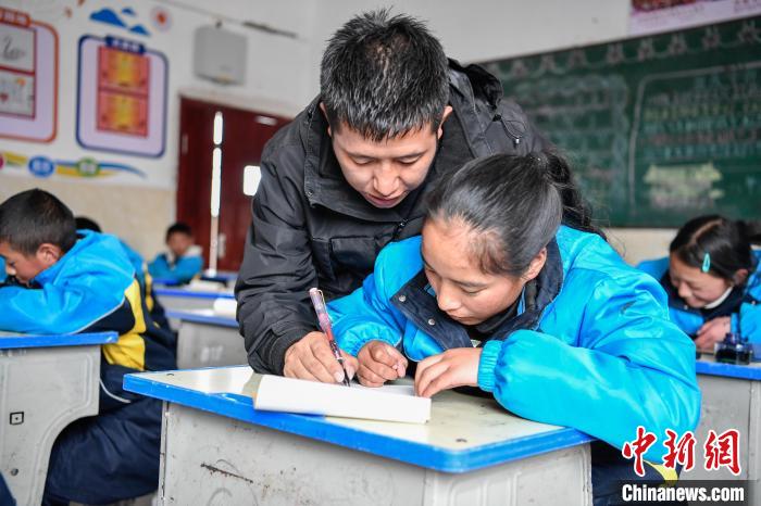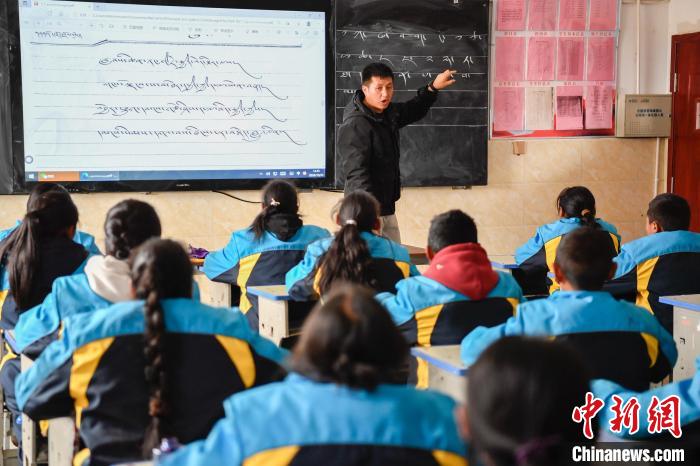 10月25日,在西藏自治區那曲市聶榮縣中學,學生在老師的帶領下學習藏文書法。中新社記者 貢嘎來松 攝