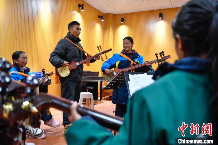 10月25日,在西藏自治區那曲市聶榮縣中學,學生在老師的帶領下學習扎念琴。中新社記者 貢嘎來松 攝