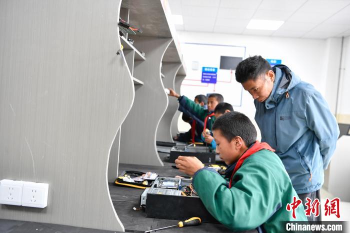 10月25日,在西藏自治區那曲市聶榮縣中學,學生在老師的帶領下學習舊電腦拆裝。中新社記者 貢嘎來松 攝
