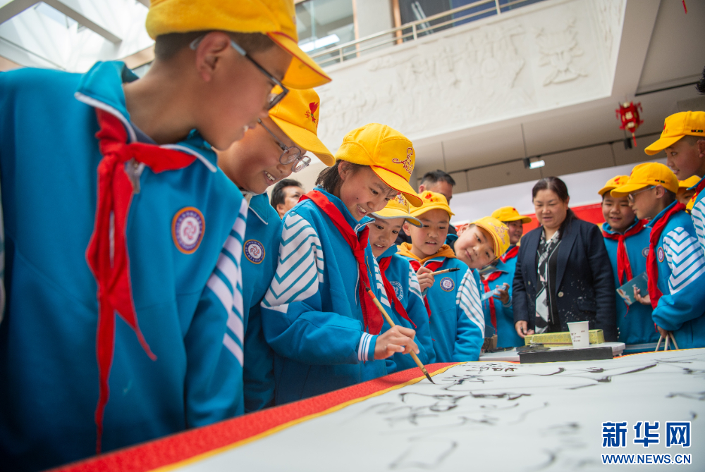 4月9日,拉薩市城關(guān)區(qū)雪小學(xué)學(xué)生在西藏自治區(qū)圖書(shū)館讀書(shū)活動(dòng)現(xiàn)場(chǎng)體驗(yàn)書(shū)法。新華網(wǎng) 旦增努布 攝