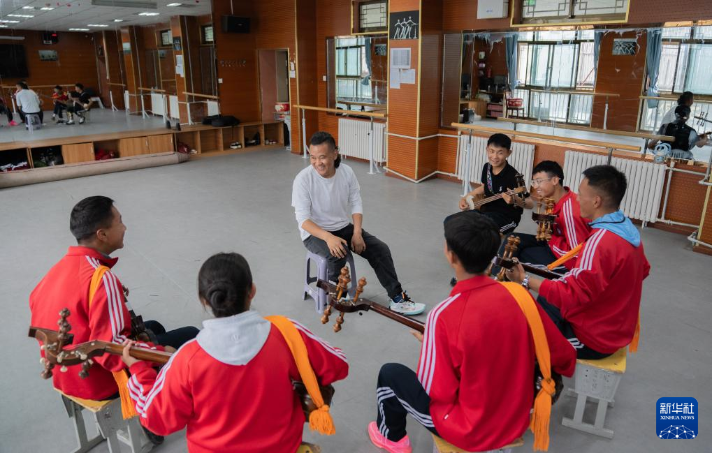 9月9日,在拉薩市第二中等職業(yè)技術(shù)學(xué)校,洛桑次仁老師在給孩子們傳授扎念琴彈奏的要領(lǐng)。新華社記者 丁增尼達(dá) 攝