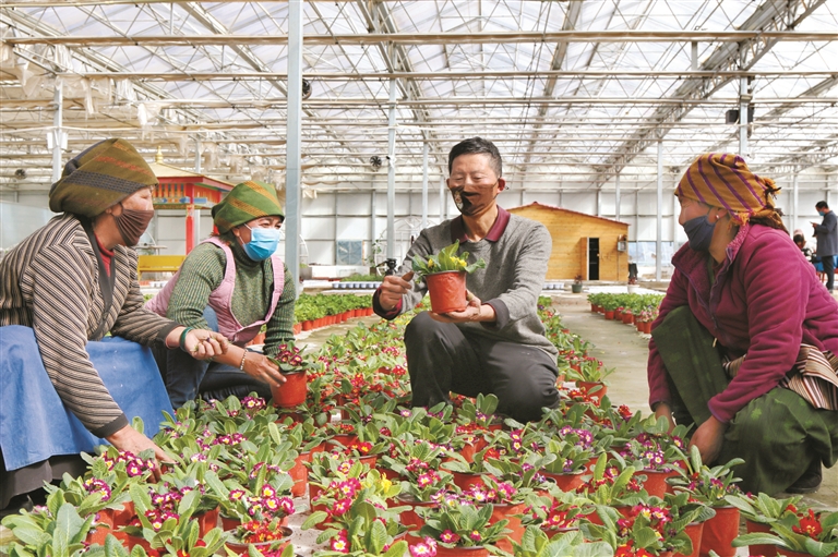 在鄉村振興建設中,林周縣走出了自己的特色致富路,優秀產業項目遍地開花。圖為技術員為群眾講解花卉種植知識。 拉薩融媒記者 龍俊霖攝