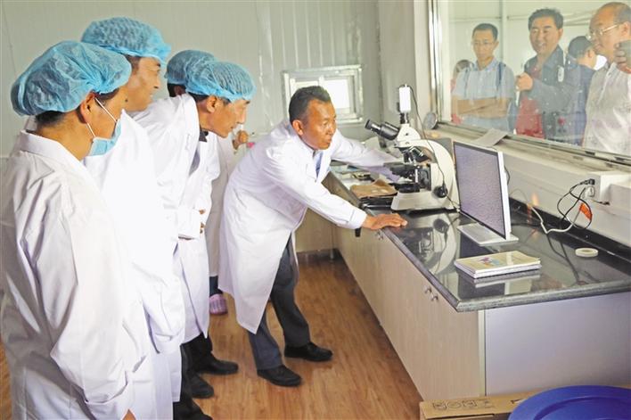 自治區農科院全國創新爭先獎章獲得者巴桑旺堆(中)向西藏農牧科技人員講解奶牛性控凍精技術。記者 李梅英 攝