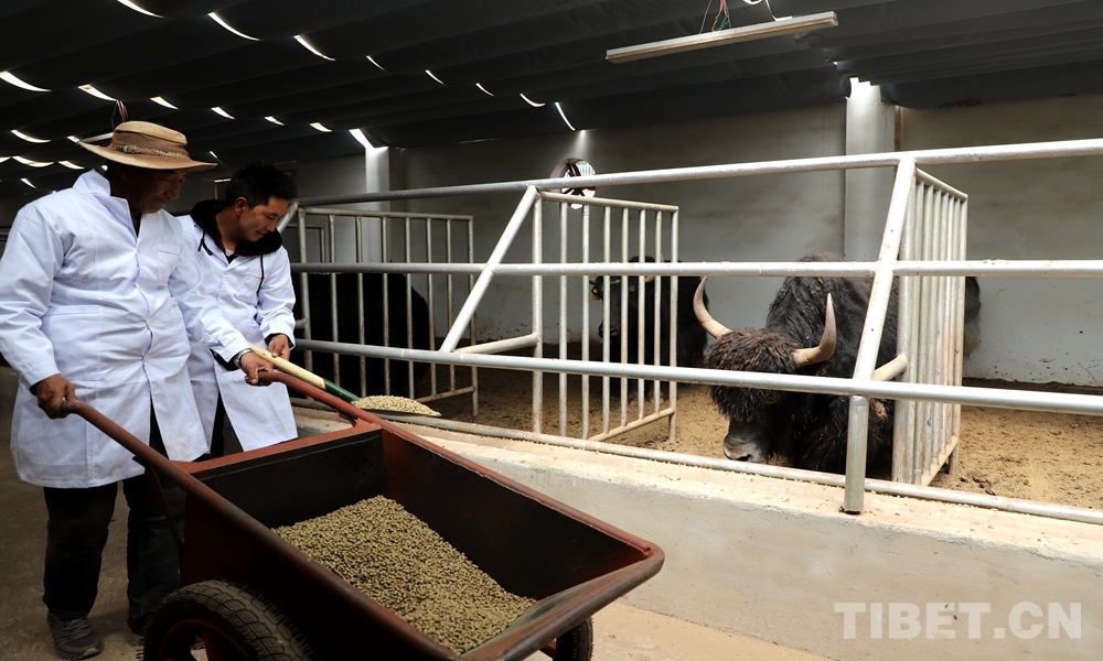 中國西藏網訊 一鏟鏟飼料倒到食槽內,牦牛悠閑地慢慢咀嚼。中午時分,西藏自治區昌都市類烏齊縣濱達鄉央宗村的向巴郎加和幾位村民正在當地的牦牛短期育肥示范基地內飼喂近期將要出欄的牦牛。