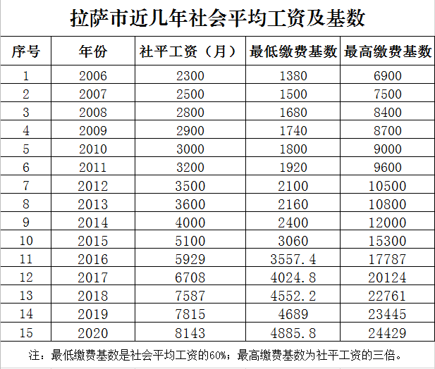 根據西藏自治區人社廳、西藏自治區財政廳、西藏自治區統計局《關于發布2020年上年度全區職工月平均工資的通知》(藏人社發〔2020〕82號)精神,2020年社會平均工資為8143元/月,新的繳費基數上下限及繳費標準從2020年1月1日起執行。