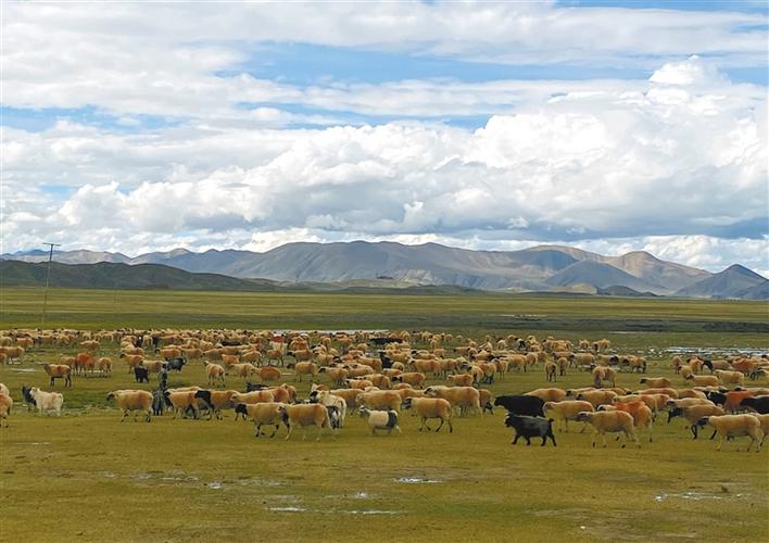 西藏山南市浪卡子縣羊卓草原上 羊兒成群草原美