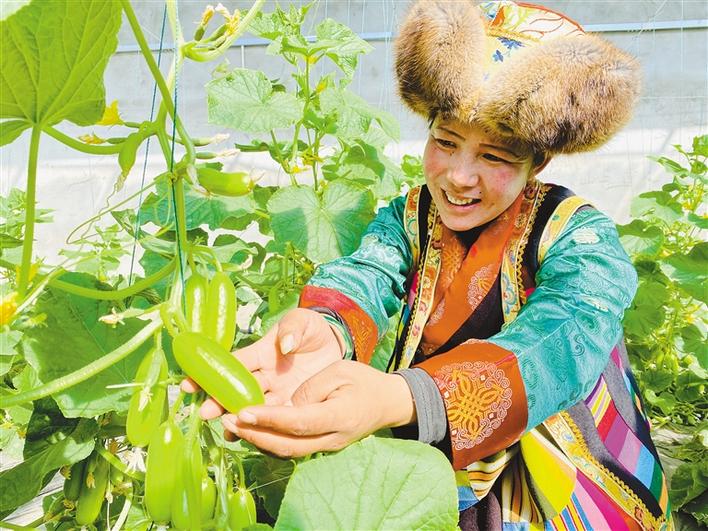 圖為山南市瓊結縣相達村村民次仁措姆在基地內(nèi)采摘拇指黃瓜。倫珠澤仁 記者 洛桑 攝