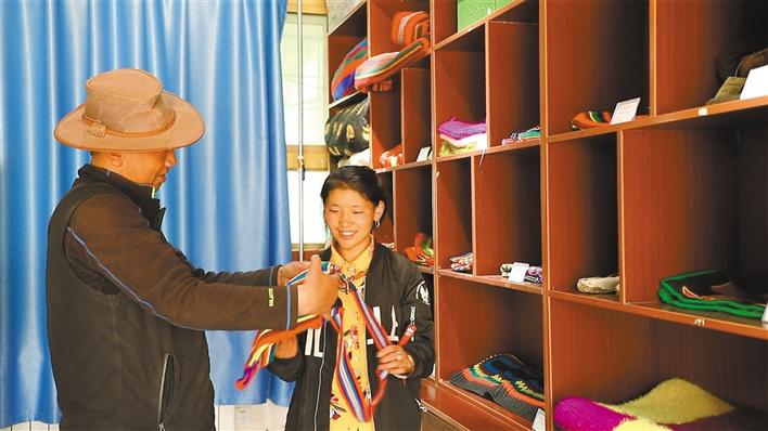 圖為在措勤縣民族特色產(chǎn)業(yè)線下體驗館工作的貧困戶頓珠(右)為顧客推介當?shù)禺a(chǎn)品。記者 溫凱 洛桑旦增 攝