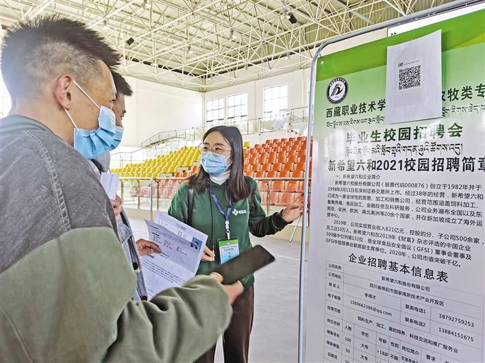 圖為西藏職業技術學院2021屆農牧類專業畢業生校園招聘會現場,新希望六和股份有限公司工作人員向學生介紹招聘信息。記者 王莉 攝
