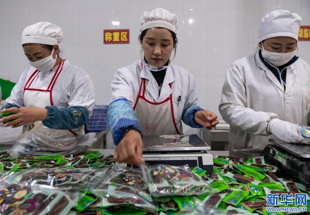 在西藏奇圣土特產品有限公司生產車間內,工作人員在分裝牦牛肉(2019年12月31日攝)。新華社記者 孫非 攝