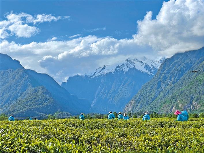 天朗氣清,茶韻悠悠。西藏林芝波密縣易貢茶場里,油菜花開得正艷;廣袤的湖畔牧場上,馬牛成群;茶農們穿梭在茶林間,他們身挎茶簍,兩手并用,掐準“一葉一茶”,快速放入簍里,舉手低頭間,茶簍逐漸被裝滿。
