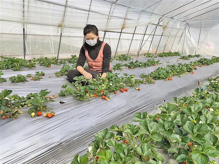 圖為巴宜區更章鄉久巴村村民白瑪卓瑪在打理草莓大棚。 記者 胡文 攝