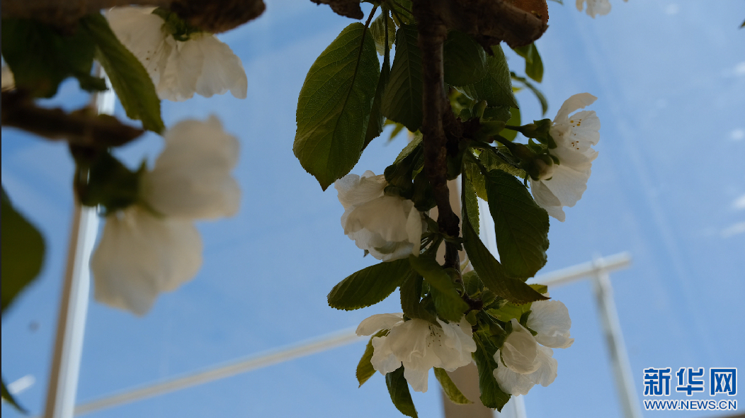 圖為吞彌現代農業產業園區大棚里盛開的車厘子花。新華網發 貢桑央吉(實習生)攝