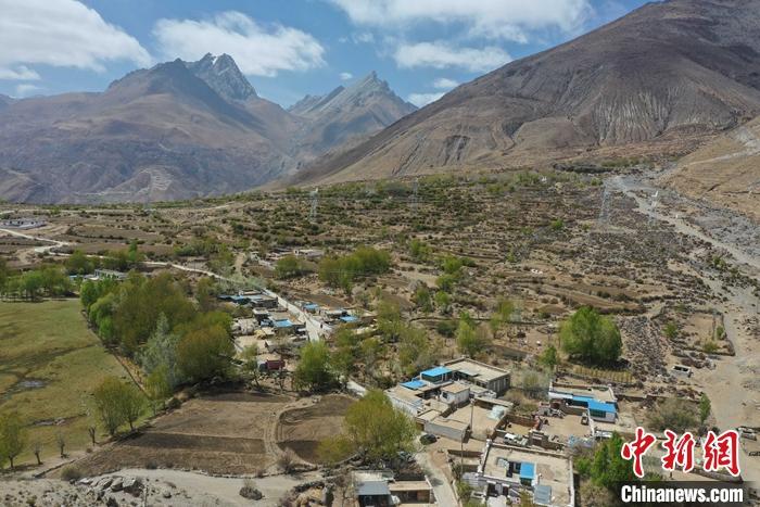 圖為4月12日,色麥村柳樹吐綠,春意濃濃。(無人機照片)。 中新社記者 貢嘎來松 攝