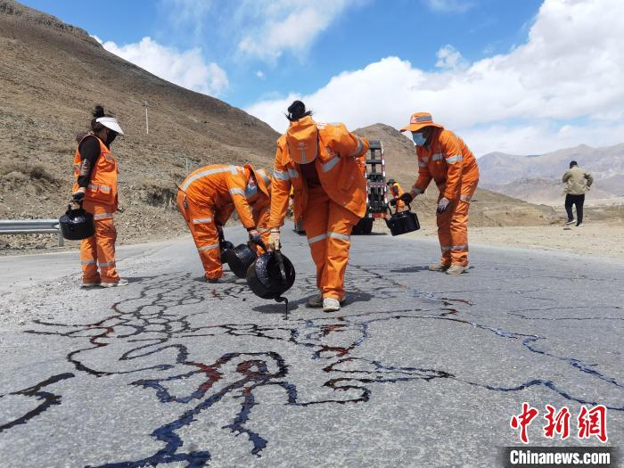 圖為在基層農(nóng)村公路,女護路員正熟練地開展瀝青灌縫作業(yè)。 西藏自治區(qū)交通運輸廳供圖