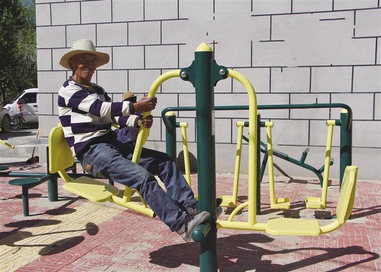 拉薩市民在健身設施上鍛煉。