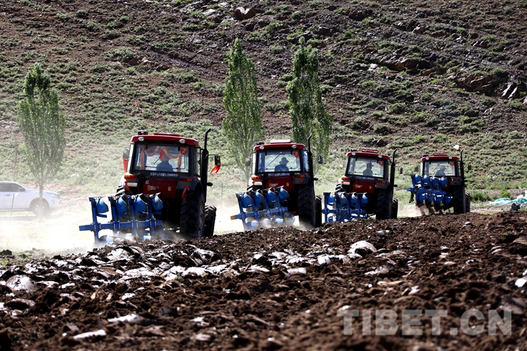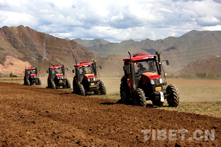 圖為在曲嘎強(qiáng)村四臺(tái)農(nóng)用機(jī)械聯(lián)合作業(yè)耕種飼草 攝影:王佳豪
