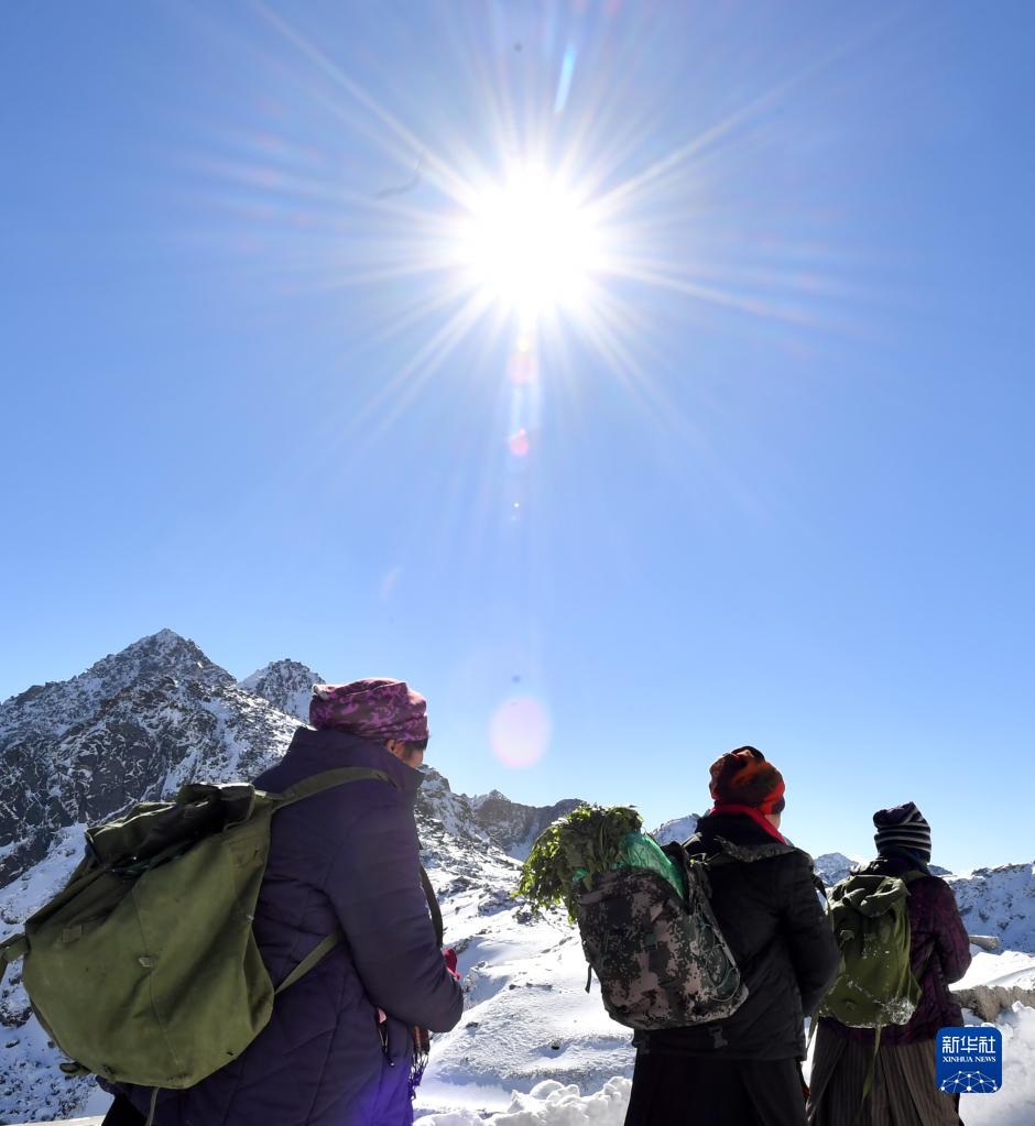 西藏亞東縣仁青崗村的達吉、次仁曲珍和普赤三位藏族老阿媽在前往詹娘舍哨所送菜的路上(2022年1月27日攝)。新華社記者 覺果 攝