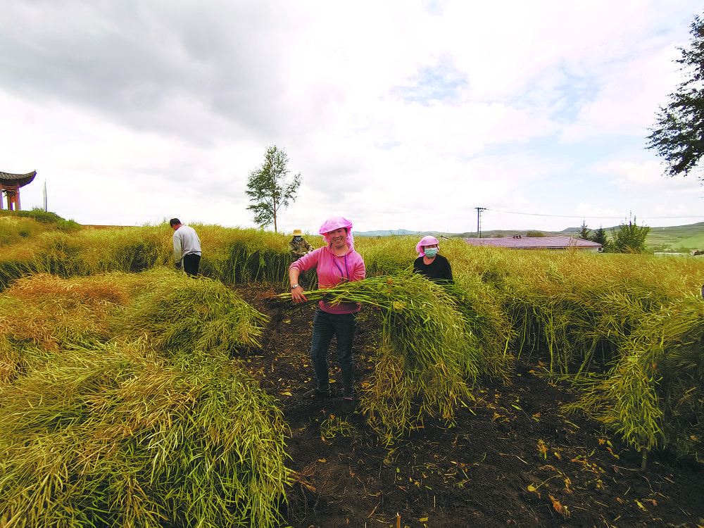 農戶正在收割油菜籽。