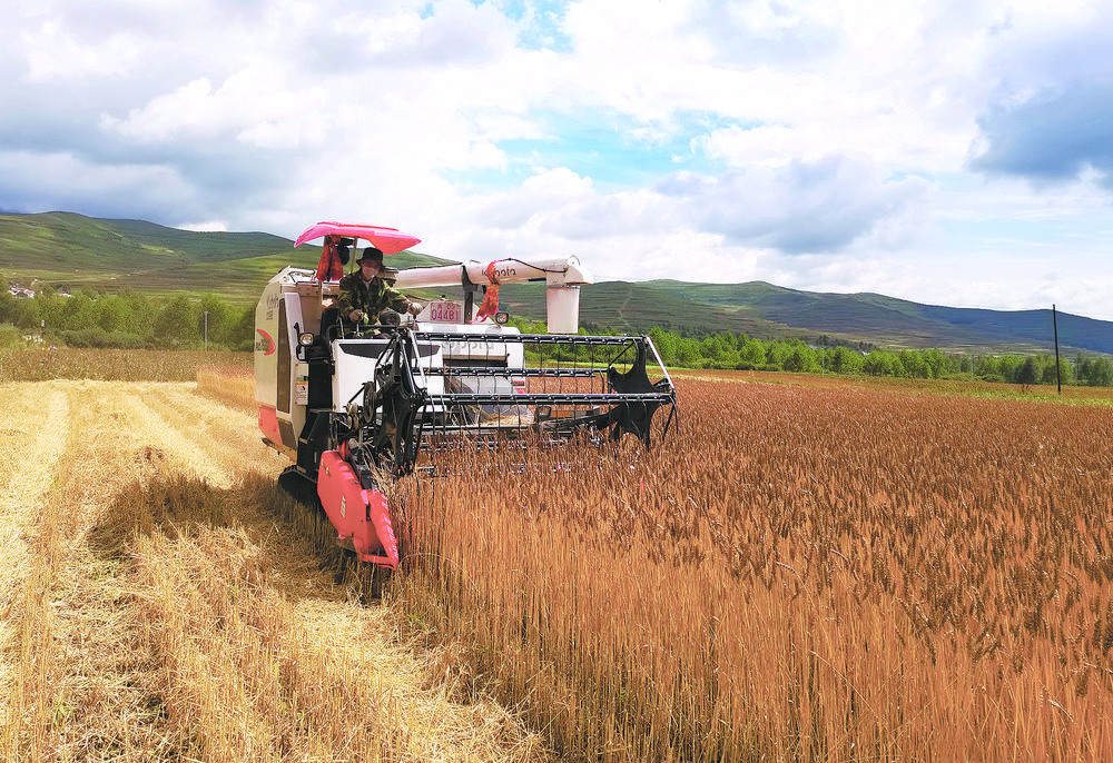 收割機穿梭在金色麥浪中。
