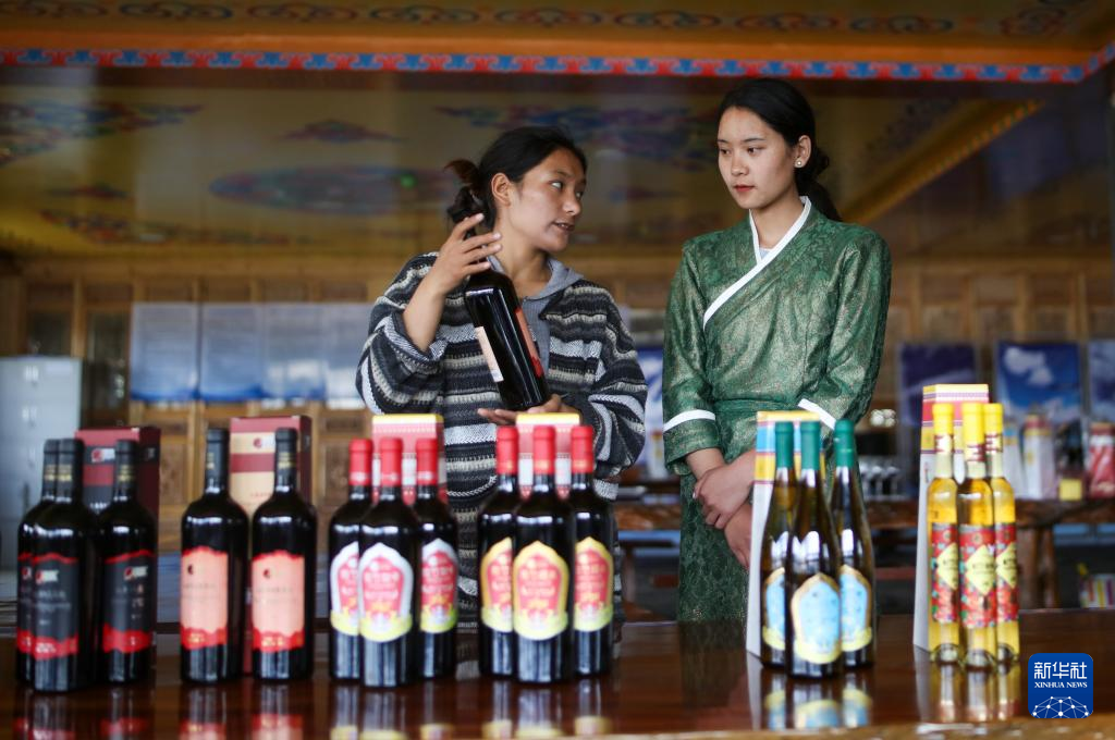 7月26日,桑日縣一家葡萄酒企業的員工曲珍(左)在跟同事一起練習企業葡萄酒產品介紹。新華社記者 旦增尼瑪曲珠 攝