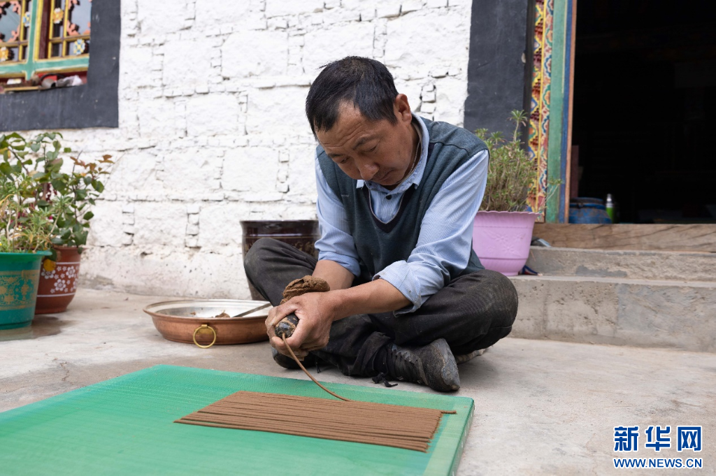 工作時(shí),格桑次仁會(huì)盤腿坐于門前,熟練地揉搓著盆中的香泥,待其成型后再迅速放入帶孔的牛角中,用靈巧的手指擠出一道道筆直的線條,一根根均勻的藏香便呈現(xiàn)在人們的眼前。經(jīng)過晾曬成型之后,這些藏香將會(huì)被送至附近的大小寺廟,或是通過電商渠道發(fā)往全國各地。