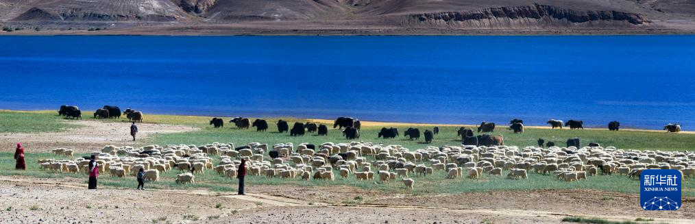 牧民在阿里地區日土縣班公湖畔放牧白絨山羊和牦牛(無人機照片,9月21日攝)。新華社記者 姜帆 攝