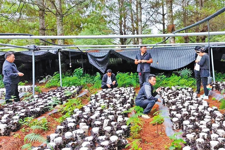 林芝市墨脫縣格當鄉林下資源合作社技術員查看木耳長勢。