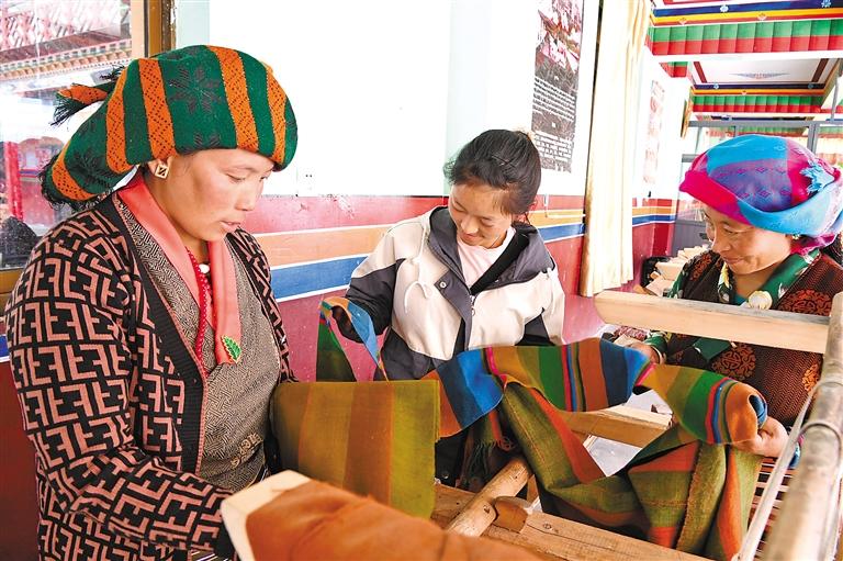 圖為日喀則市仁布縣康雄鄉亞德細褐羊毛織品農民專業合作社的編制能手在傳授編制技藝。記者 李洲 攝